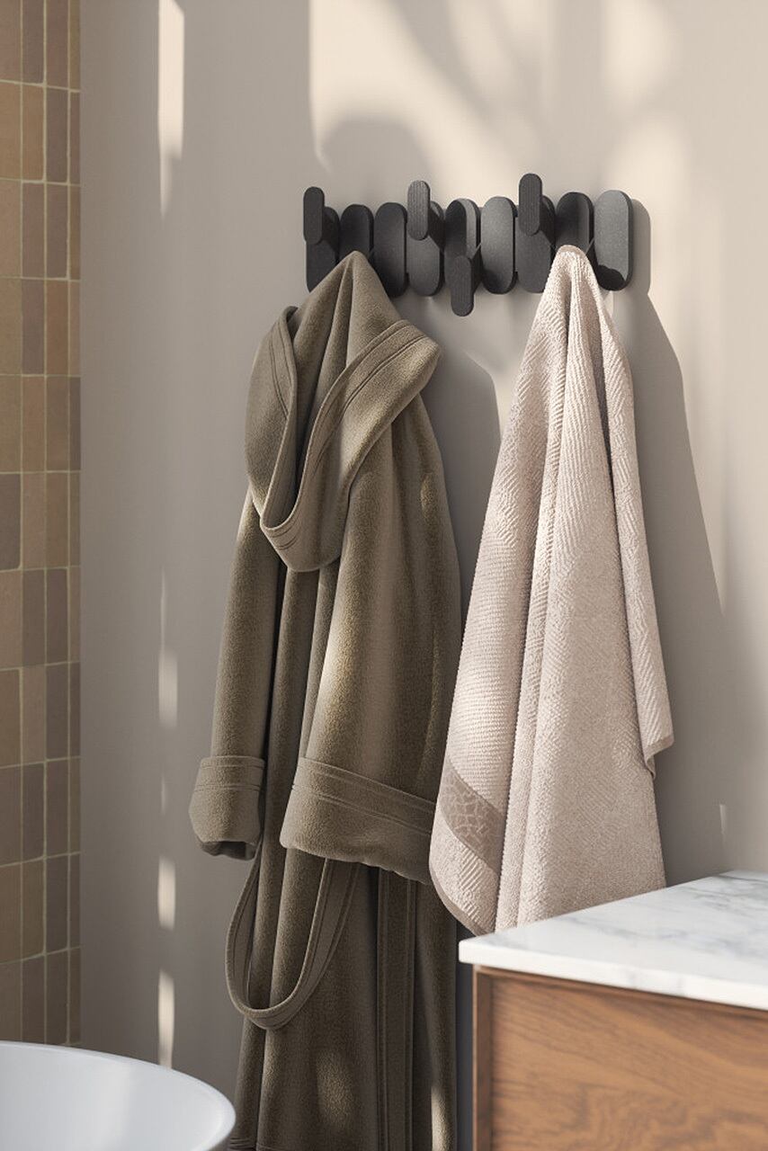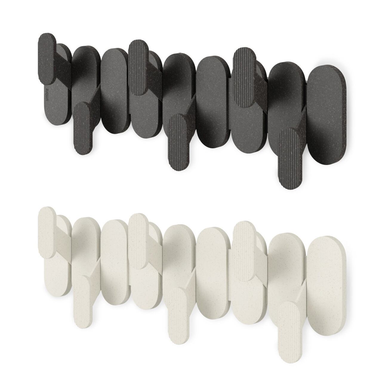 モダンなスタイルと日常的な機能性を、洗練された壁掛けデザインに融合させました。6つのフックが交互に配置され、吊り下げスペースを最大限に活用しながら、壁に印象的でグラフィカルな雰囲気を演出します。耐荷重は各フックあたり約2.3kgでコートやバッグ、タオルなど様々な引っ掛け収納に対応します。