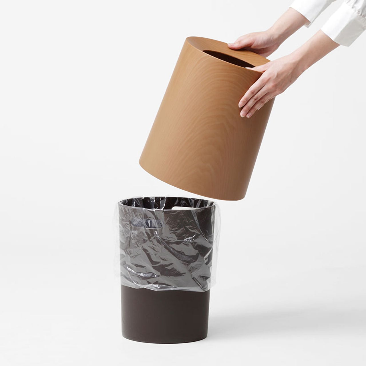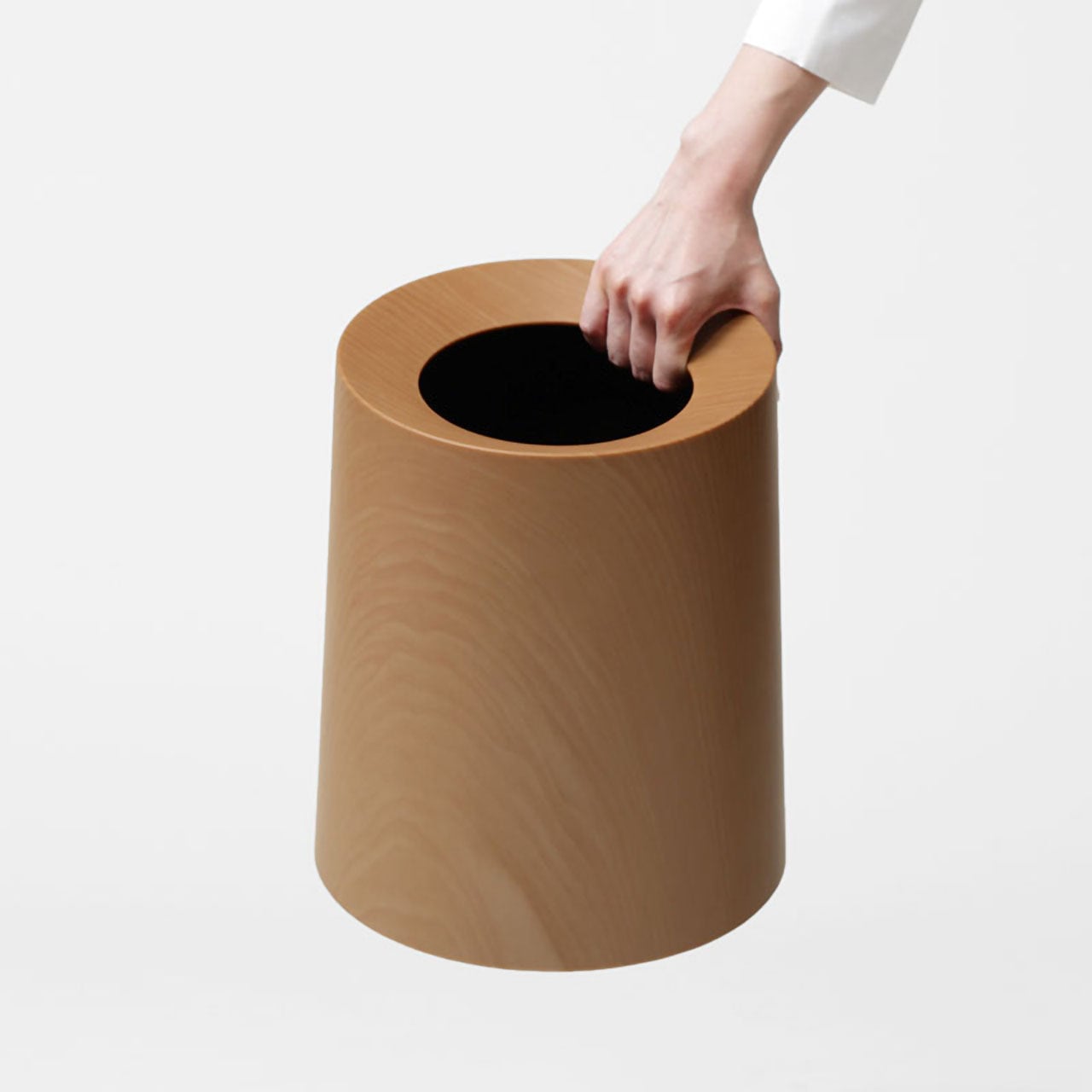2008年にデビュー、今や世界中の定番になったチューブラーオム。カバーを被せるだけで中のポリ袋を隠してくれるゴミ箱。多彩なカラー展開の中でもこの木目調のラインナップは温かみのある雰囲気で多様なインテリアにマッチします。ボトム本体はウェンジブラウンの統一色で、木目調のカバーとのコンビカラーも魅力。ゴミ箱"TUBELOR"のひと回り大きいサイズで、ideacoで最も人気のサイズです。ボトム本体には持ち手の穴を設けているので、カバーとボトムを片手で一緒に持ち上げられ、女性でも楽に移動させることができます。