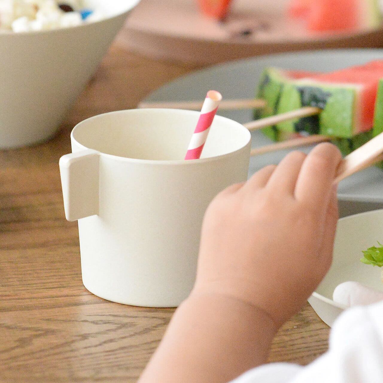 取手がかわいいバンブーメラミン素材のコップ。高さは7cmと低めの設計。