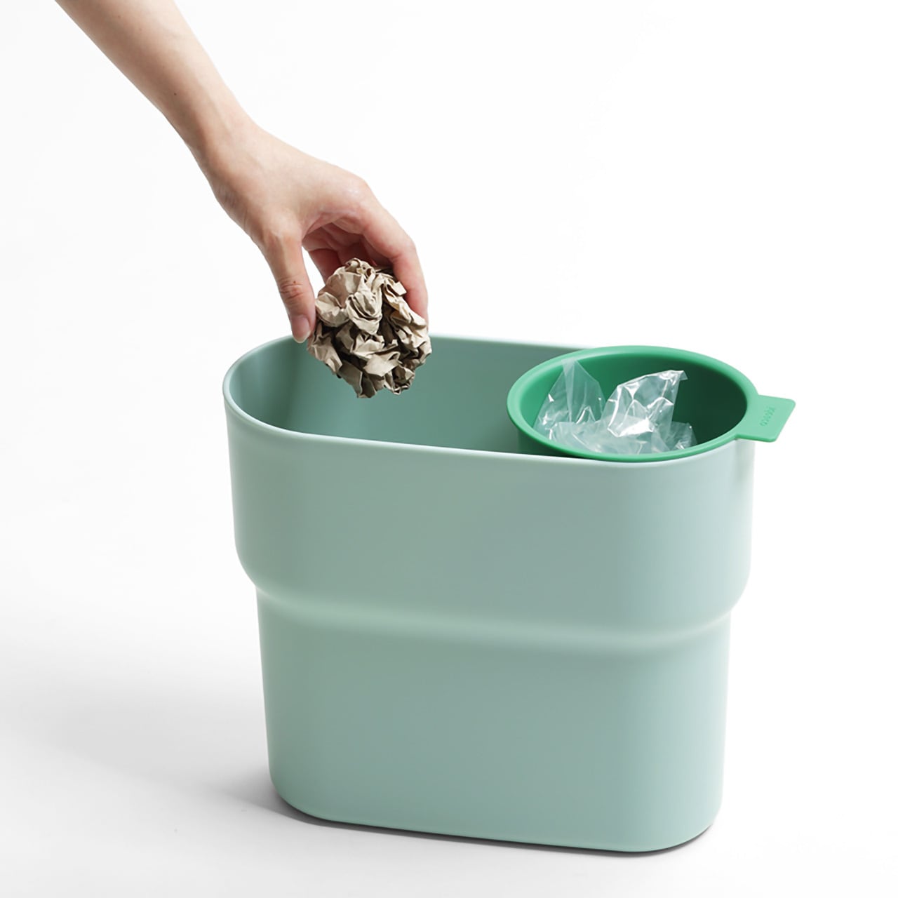 パウダールーム、子ども部屋など、さほど多くは出ないゴミも仕分けがしたい。そういったニーズにお応えするに最適なサイズ感と分別設計のゴミ箱です。取り外しができるミニカップが付いており、大きい方に燃えるゴミ、ミニカップにはプラスチックゴミなど、ゴミを分別しやすい仕様。ミニカップは取り出せ、卓上でもお使いいただけます。取っ手もあり”ちりとり”のようにもお使いいただけます。カラーの組み合わせは6種類。カラフルなカラーコンビもインテリアのオシャレなアクセントになります。