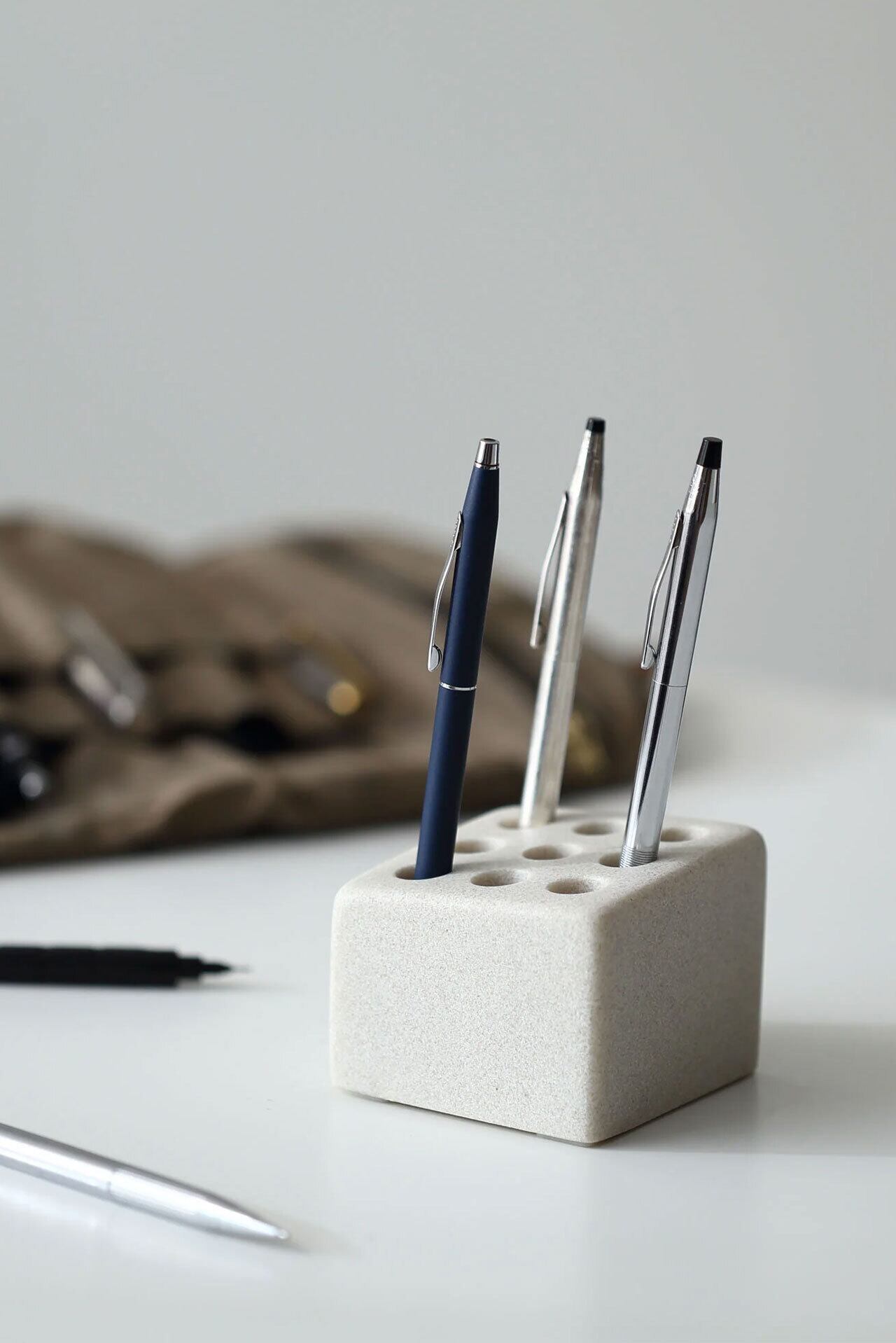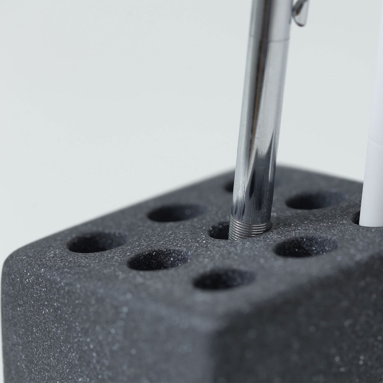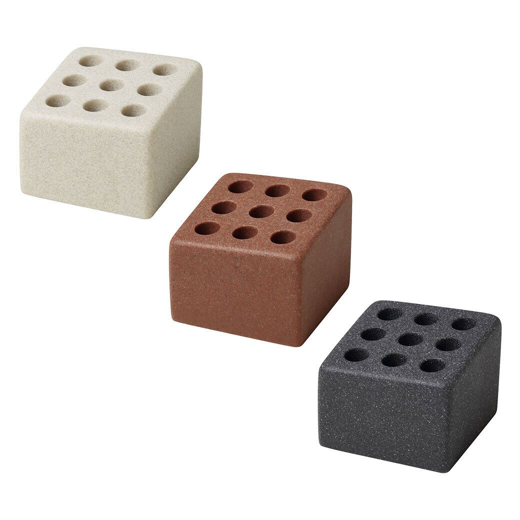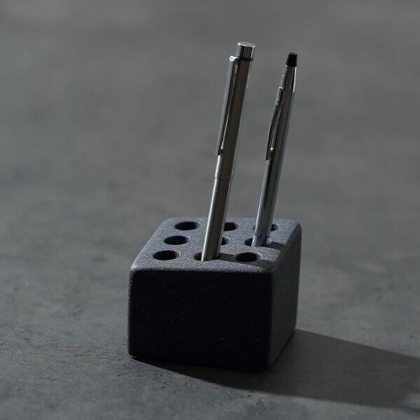 ideaco のファーストプロダクト、傘立て「CUBE」。傘をシンプルに整列させるその思想を、筆記具へとインストール。“整える”という美学を卓上向けのプロダクトとして再構築。後列ほど穴の底を高くした段差構造で、自然と階段状に立ち、奥行きとリズムのある佇まいをつくります。