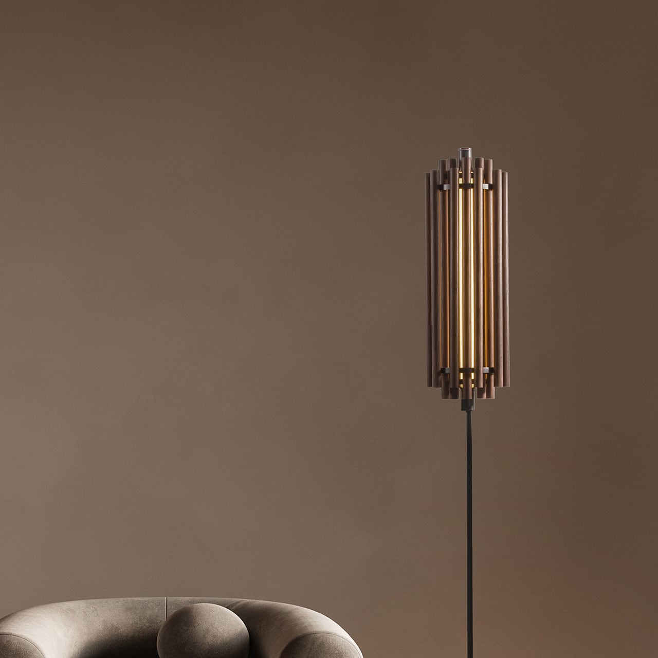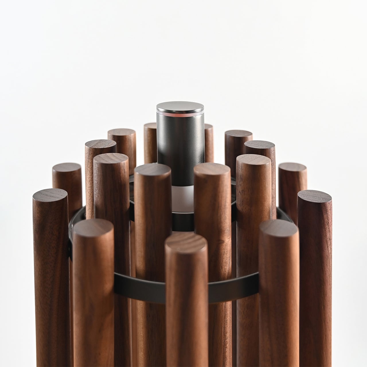 森の木々の隙間から漏れる光のイメージを照明で再現。全方位光るLED モジュールを光源とし、スリットから僅かに光が漏れてくるよう天然木を重なるように配置。木の間から漏れる光が木漏れ陽のような照明をつくりました。シェード上部をタッチして調光やオンオフの操作可能。リビングルームやベッドルームに落ち着いた光の演出ができます。本体上部にタッチセンサースイッチを設け、オン/ オフを簡単切り替え。長押しすれば調光も可能。天然木で高級感のあるホワイトオークとウォルナット素材を使用し、他の家具との調和性があります。